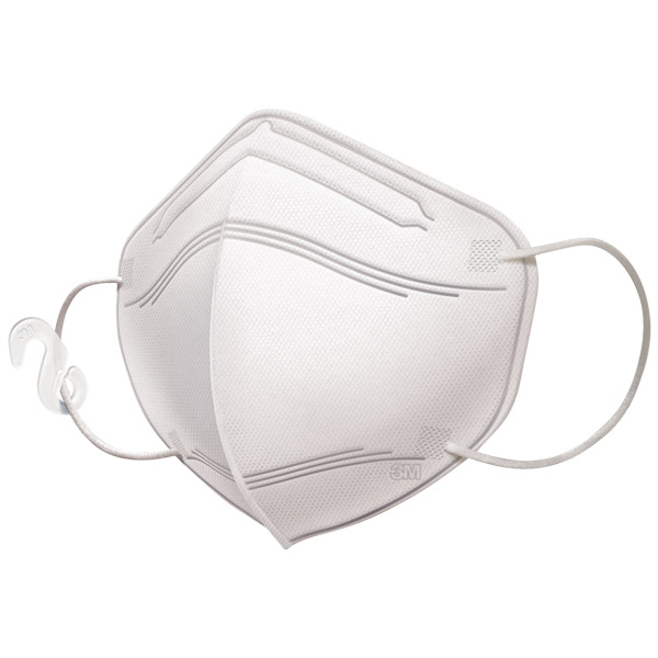 The respirator is worn over the mouth and nose and attaches via elastic side bands with hook attachment behind the base of the head/top of the neck