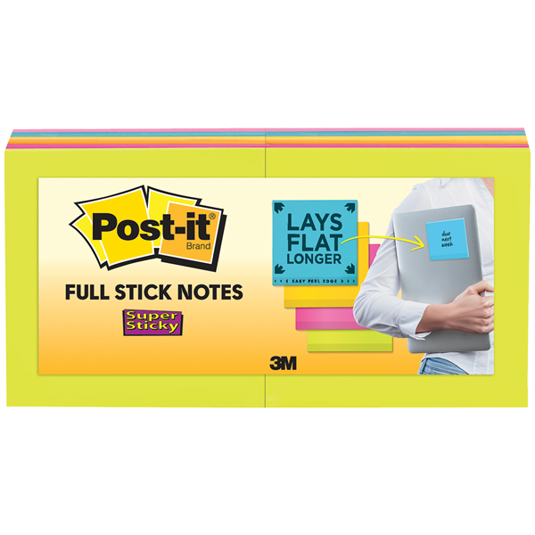 Post-it super sticky full stick notes have a larger adhesive area sticks securely, removes cleanly.