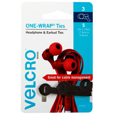 VELCRO BRAND ONE-WRAP CABLE TIES HEADPHONE AND EARBUD 6 X 76MM BLACK PACK 3